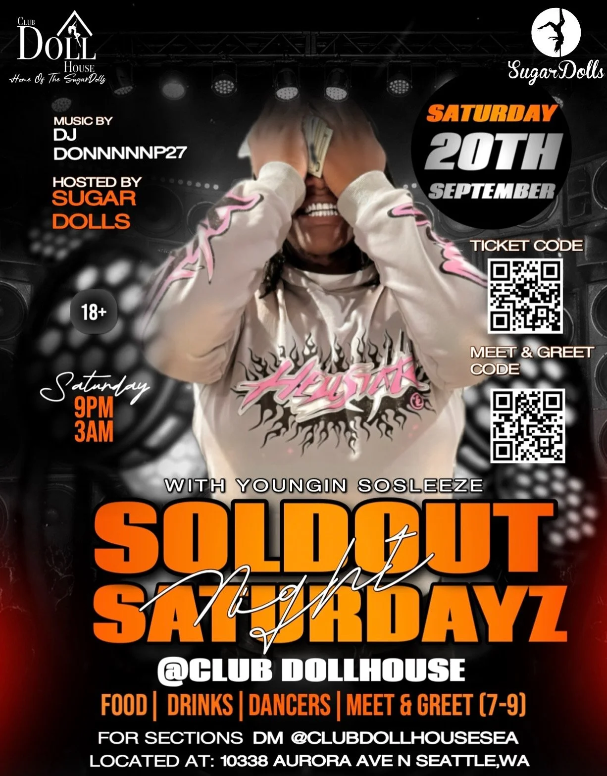 Club Dollhouse presents Soldout Saturdayz, the livest weekend party in the city. Hosted by the Sugar Dolls and powered by DJ Donnnnnp27, this night is all about high energy, good music, food, and unforgettable vibes. Featuring YounginSosleaze, the party runs late—so come ready to turn up from start to finish.