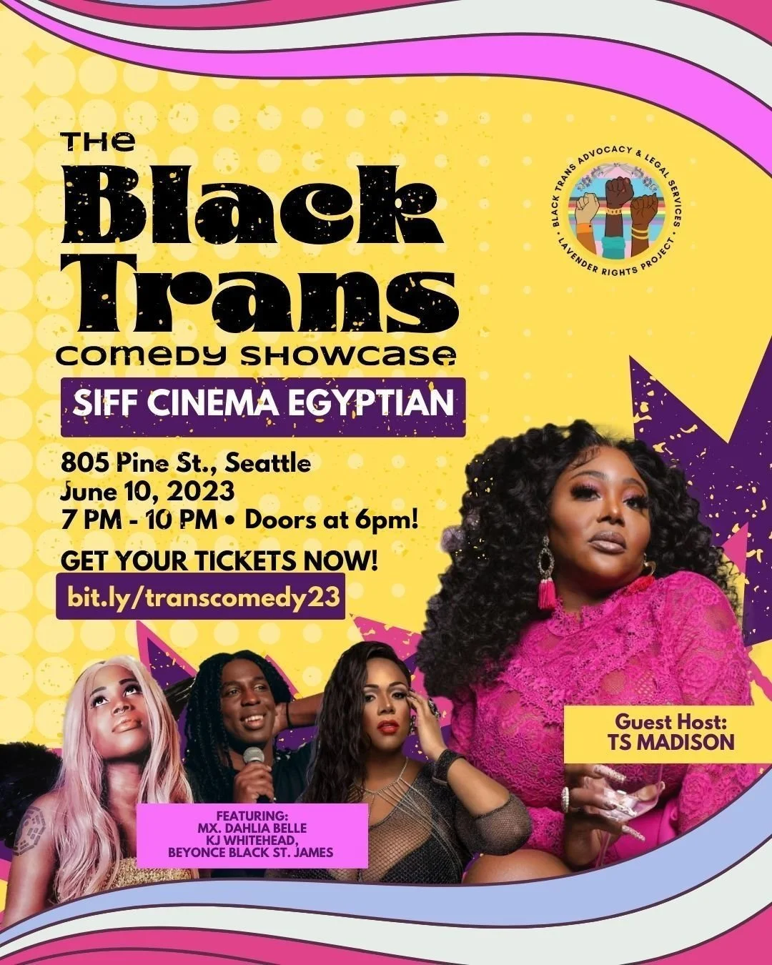 It’s about that time again! Please join us for a much, much needed night of laughter, community, and resistance while we fundraise for Black trans liberation! There will be light refreshments, raffle prizes, opportunities to interact with performers (bring yall’s tips!), and so much more! Come ready to donate as you learn about LRP’s work to protect Black trans life in Washington State and beyond! Get your tickets now to start off your Pride season the right way—with us—at Lavender Rights Project’s Black Trans Comedy Showcase 2023! It’s going to be a Ki!