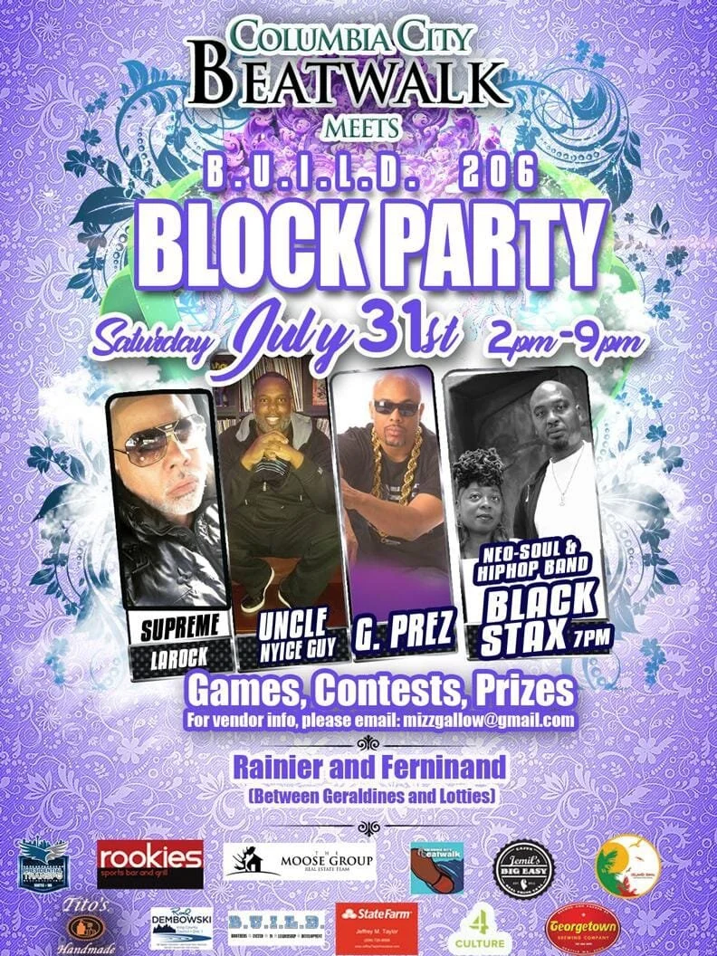 BUILD 206 in partnership with the Columbia City Beatwalk presents BUILD the Block Party. A free family friendly event of music, fun, games, prizes, contests, performances & more. Dj Lineup includes G. Prez, Mr. Nyice Guy & Supreme. Live Music provided by Black Stax. For Vendor info contact mizzgallow@gmail.com. For volunteer & performance info contact Guy 206.409.7971