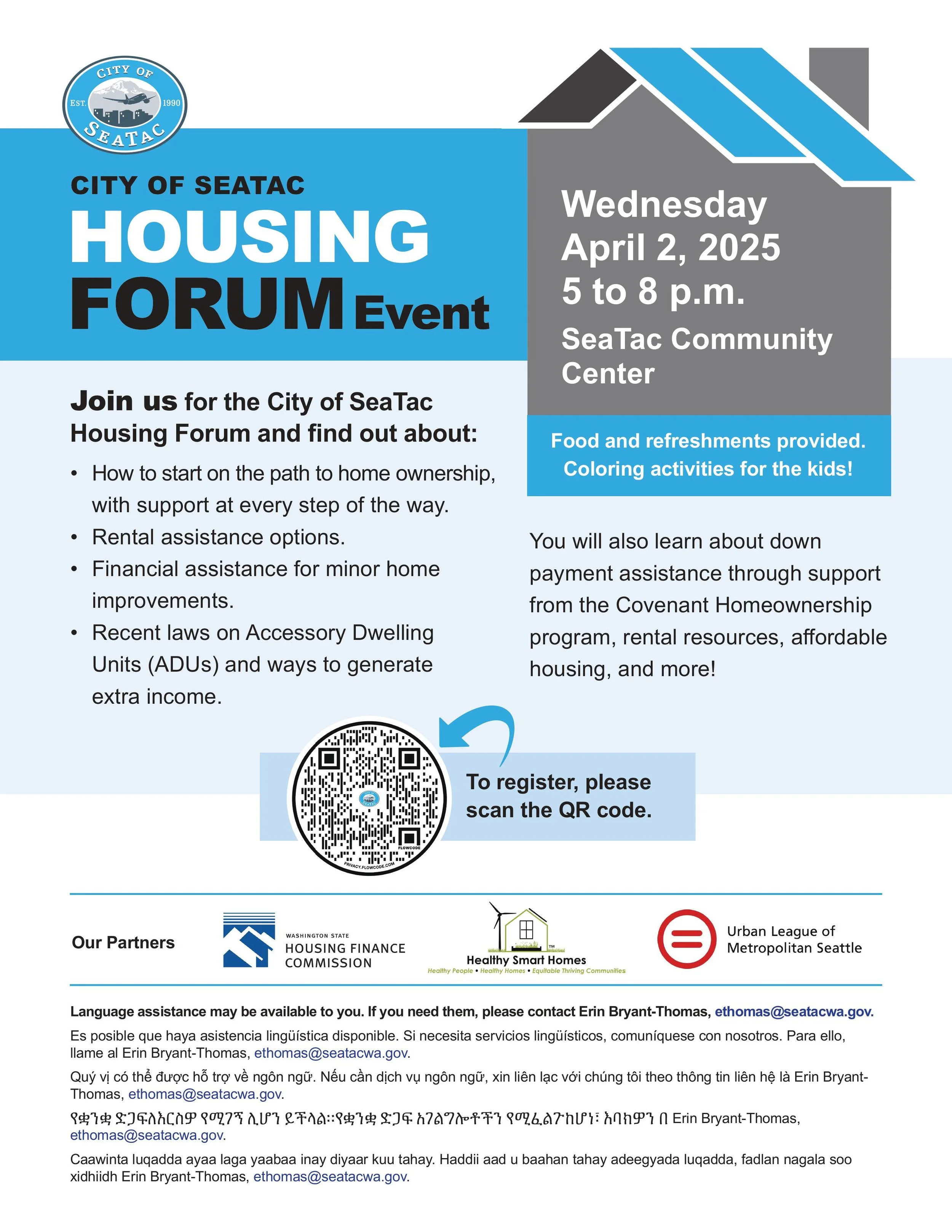 Join us for the FREE City of SeaTac Housing Forum to explore new housing options and simple steps to homeownership.