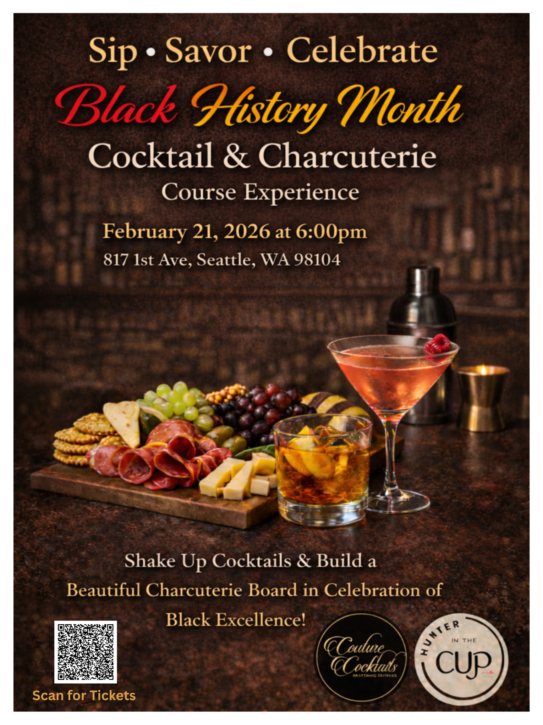 Celebrate Black Excellence at the Cocktail & Charcuterie Experience this Saturday, February 21, from 6 p.m. to 8 p.m. at Converge Media (811 1st Ave, Seattle)! Brought to you by two innovative Black woman-owned businesses, Couture Cocktails and Hunter in the Cup, this hands-on, all-inclusive workshop will teach you to master specialty cocktail creation and craft a stunning charcuterie board. At just $75, your ticket includes all materials, expert instruction, and a chance to win local Black-owned brand gifts, all while directly supporting two incredible entrepreneurs.