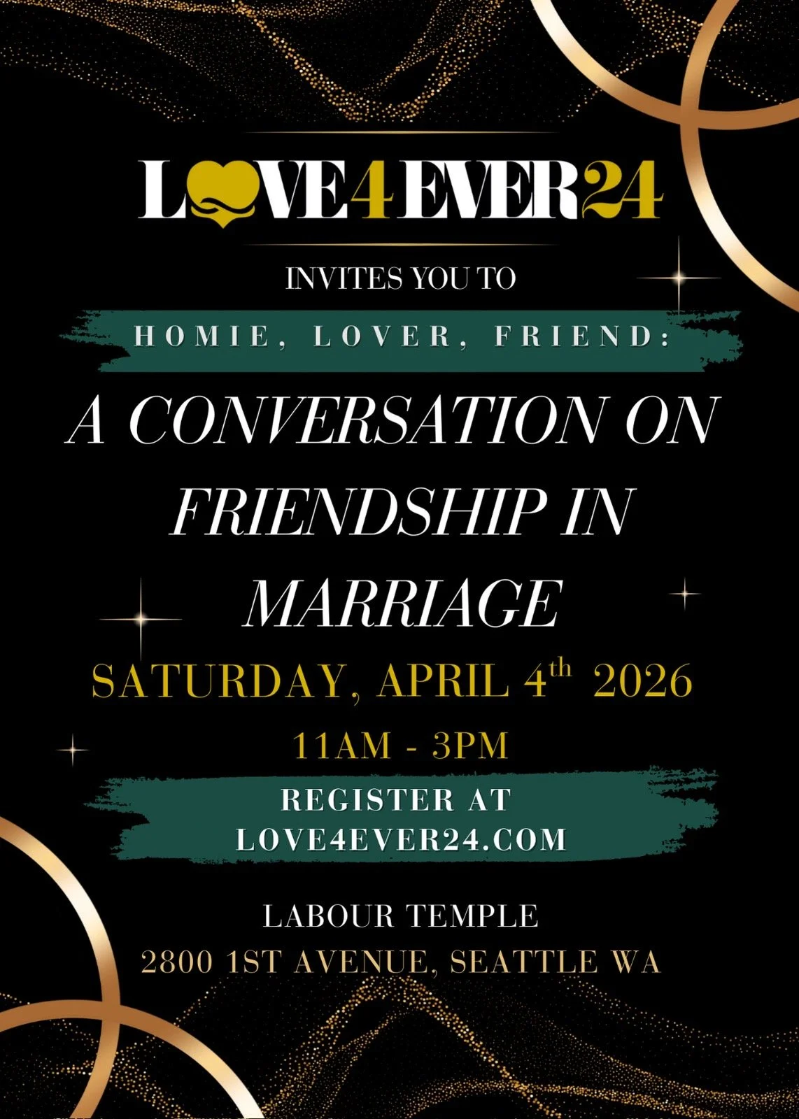 Love4Ever24 invites you to Homie, Lover, Friend: A Conversation on Friendship In Marriage on Saturday, April 4th from 11 a.m. to 3 p.m. at the Labour Temple in Seattle’s Belltown. Come for a day of growth, perspective, and celebration of love.