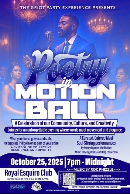 Poetry in Motion Ball 2025 Saturday, October 25, 2025 7:00 PM Sunday, October 26, 2025 12:00 AM Royal Esquire Club 5016 Rainier Avenue South Seattle, WA, 98118 United States (map) Google Calendar ICS A celebration of culture, creativity, and community through poetry, music, and performance. Dress in your finest for a curated evening featuring soul-stirring performances, a catered meal, live music, and deep conversation.