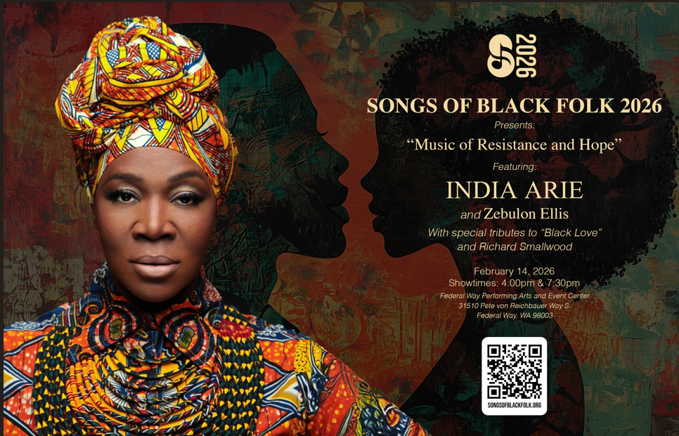 4-time Grammy Award winner INDIA ARIE is the featured performer of Songs of Black Folk 2026 on Feb. 14 (Valentines Day) at the Federal Way Performance Art and Event Center for two shows, 4pm and 7:30pm. Tickets are going fast: www.songsofblackfolk.org