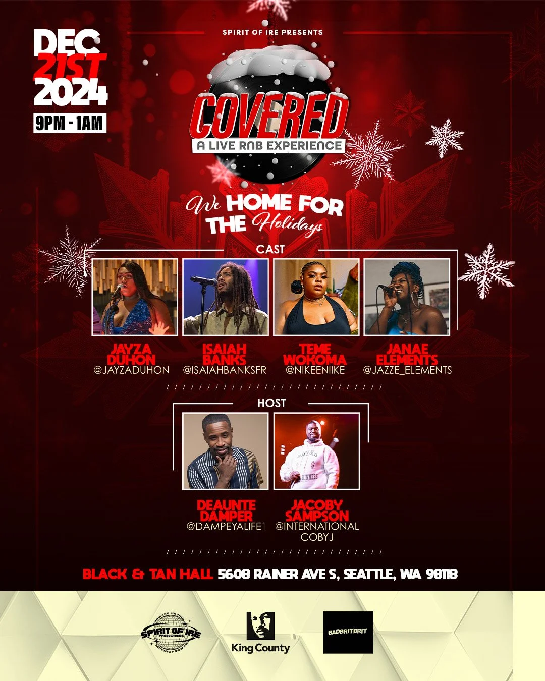 Spirt of Ire's Presents: COVERED A Live R&B Experience Saturday, December 21, 2024 9:00 PM Sunday, December 22, 2024 1:00 AM Black and Tan Hall 5608 Rainier Avenue South Seattle, WA, 98118 United States (map) Google Calendar ICS An Evening Of Live Music brings together vocalists, musicians, and producers that typically wouldn’t perform together in one space to create a unique and captivating performance.
