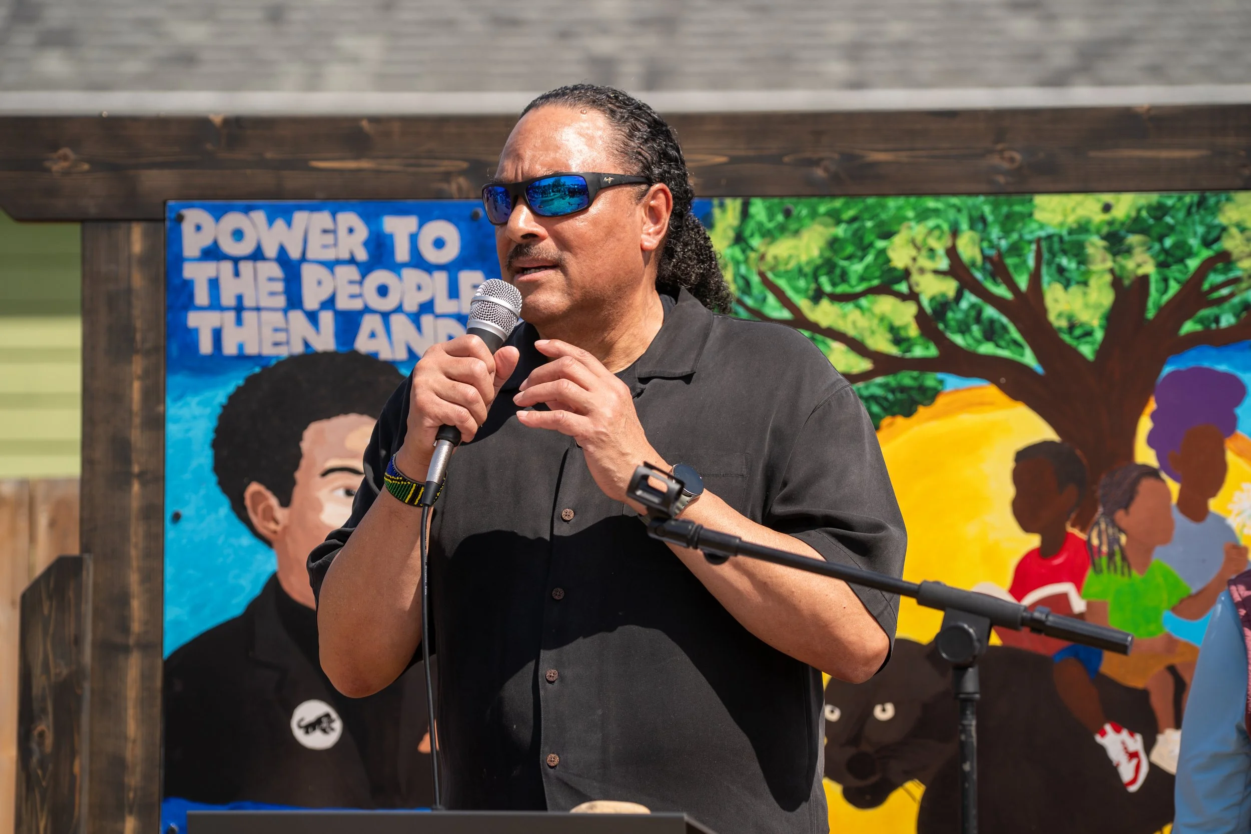 Host of the grand opening Deaunte Damper spoke on the importance of honoring the Black Panthers’ legacy and their historic community initiatives.
