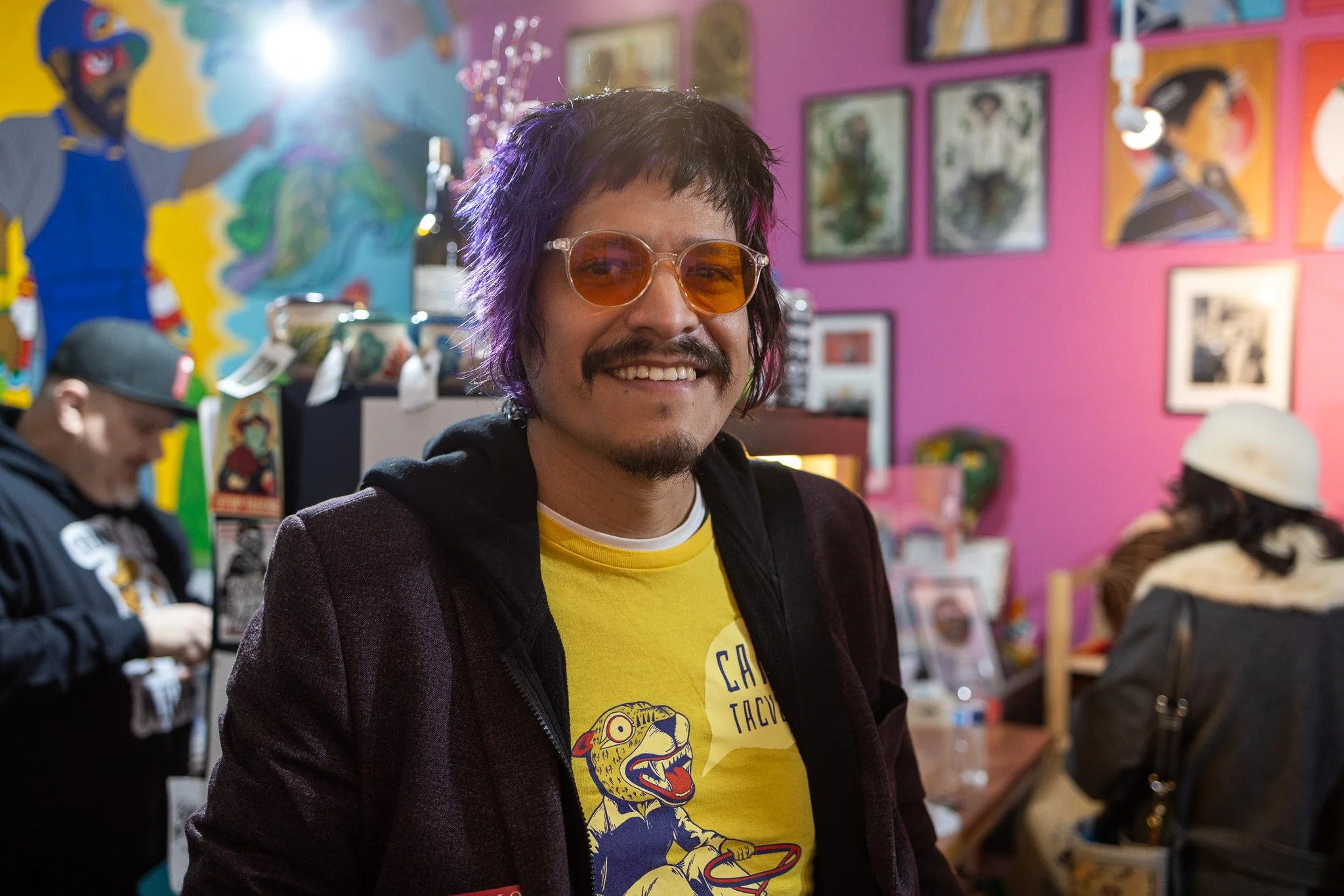 Artist Fulano De’Tal poses with his art at the Nepantla Cultural Arts Gallery. (Photo: Erik Kalligraphy)