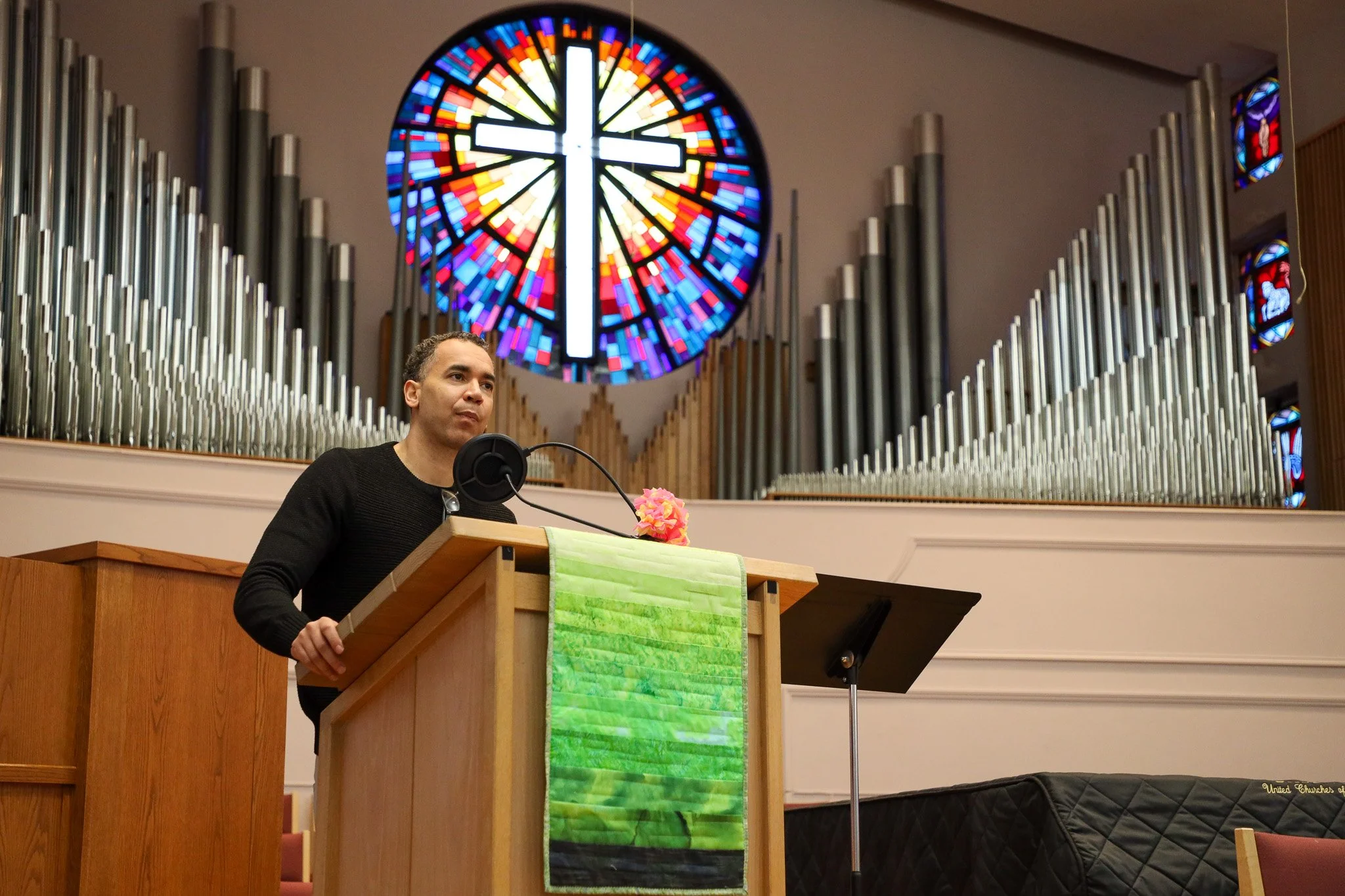 Anthony Blankenship speaks at United Churches of Olympia on Criminal Justice Advocacy Day on Monday. (Photo: Erik Kalligraphy)