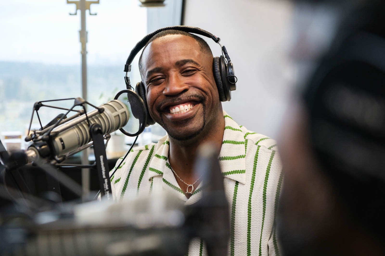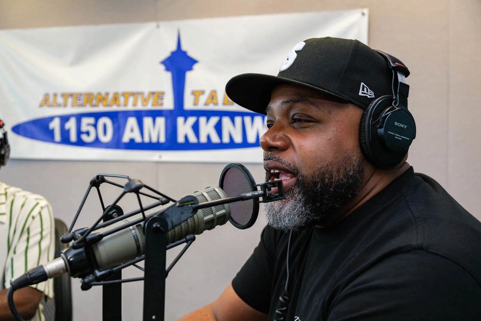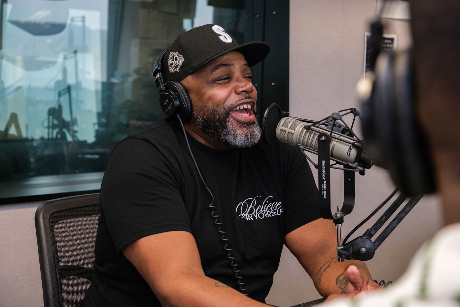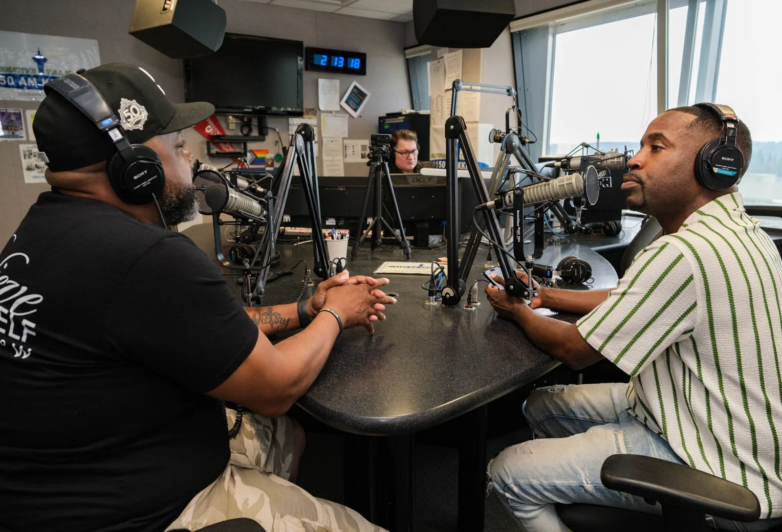 Deaunte Damper smiles in the KKNW studio across from Omari Salisbury. (Photo: Jordan Somers)