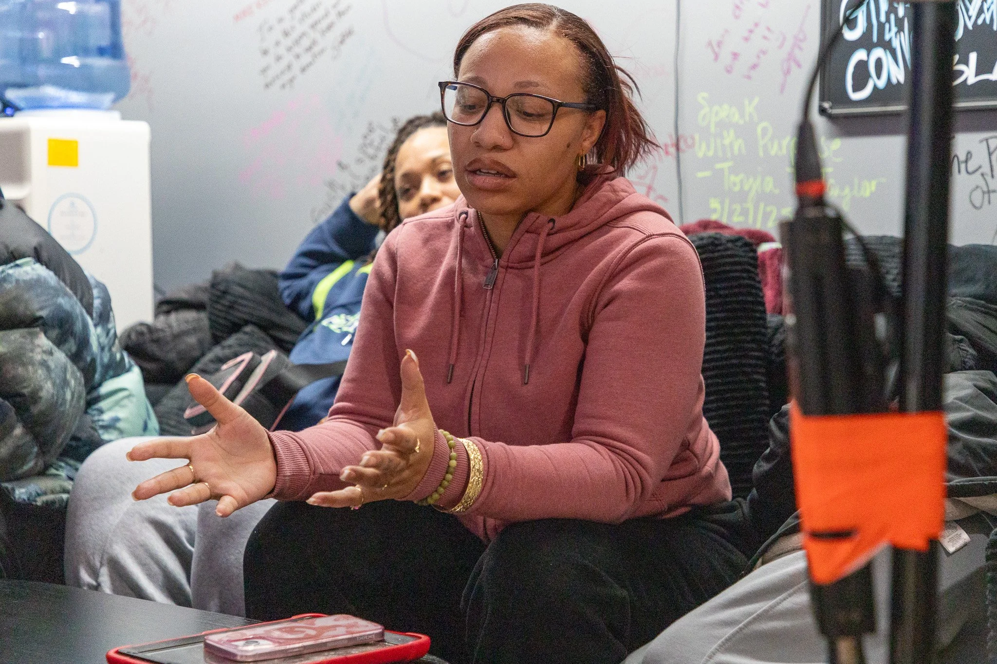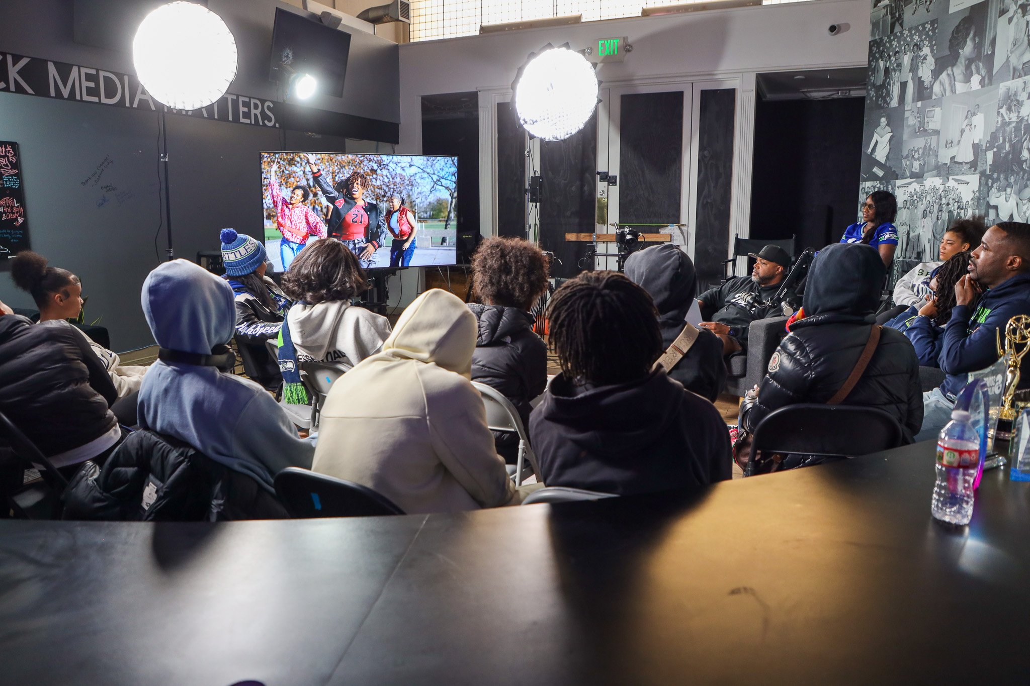 Hosts Deaunte Damper and Besa Gordon address the EYFO cohort in the Black Media Matters Studio last week. (Photo: Erik Kalligraphy)