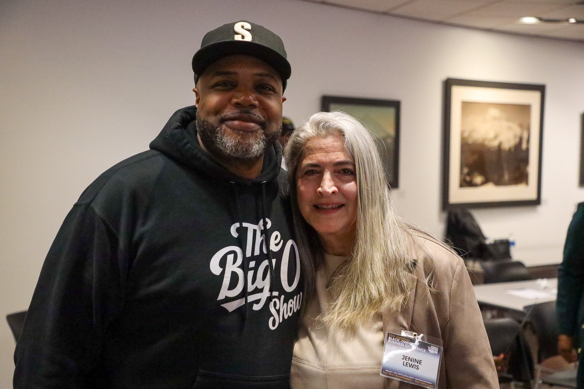 Melvin Slaughter (left) and The Big O (right) pose at the 2026 Black-Owned Business Excellence (BOBE) Symposium at the Seattle Public Library last week. (Photo: Erik Kalligraphy)