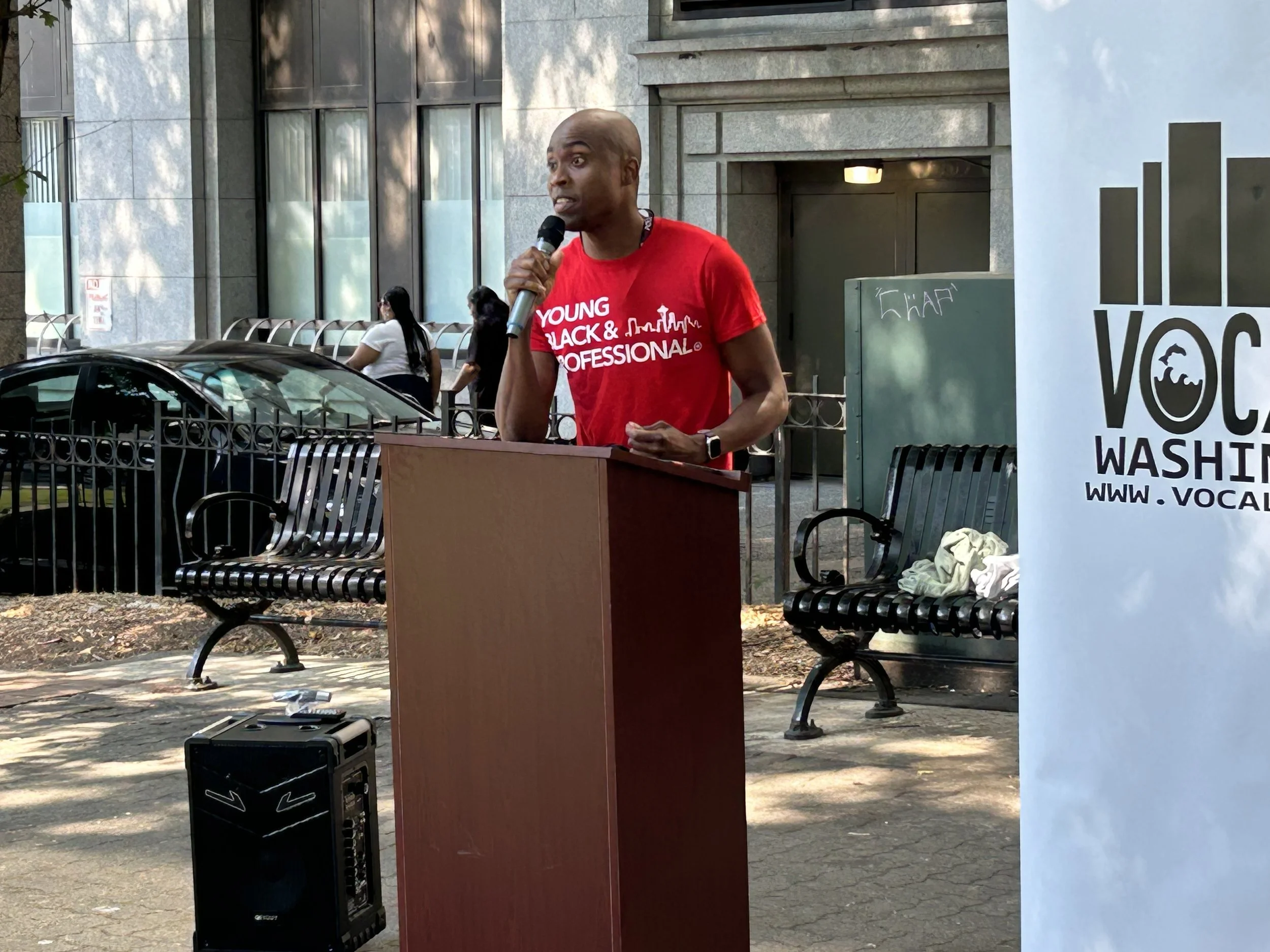 Andrew Ashiofu, Co-Chair of the Seattle LGBTQ+ Commission spoke at the International Overdose Awareness Day event at Occidental Square. (Photo: Converge Media)