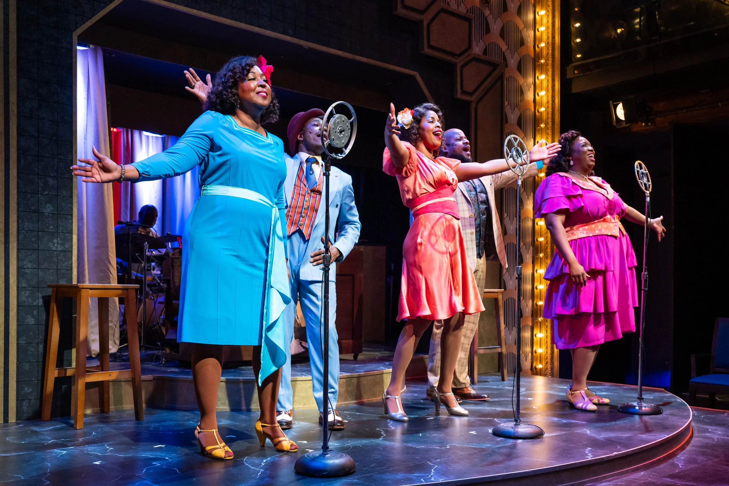 From left to right: Erica Walker as Nell, Chandler T. Thomas as Andre, Alexandria J. Henderson as Charlaine, Yusef Seevers as Ken, and Sarah Russell as Armelia in Taproot's production of Ain't Misbehavin' (March 2026). Photo: Robert Wade.